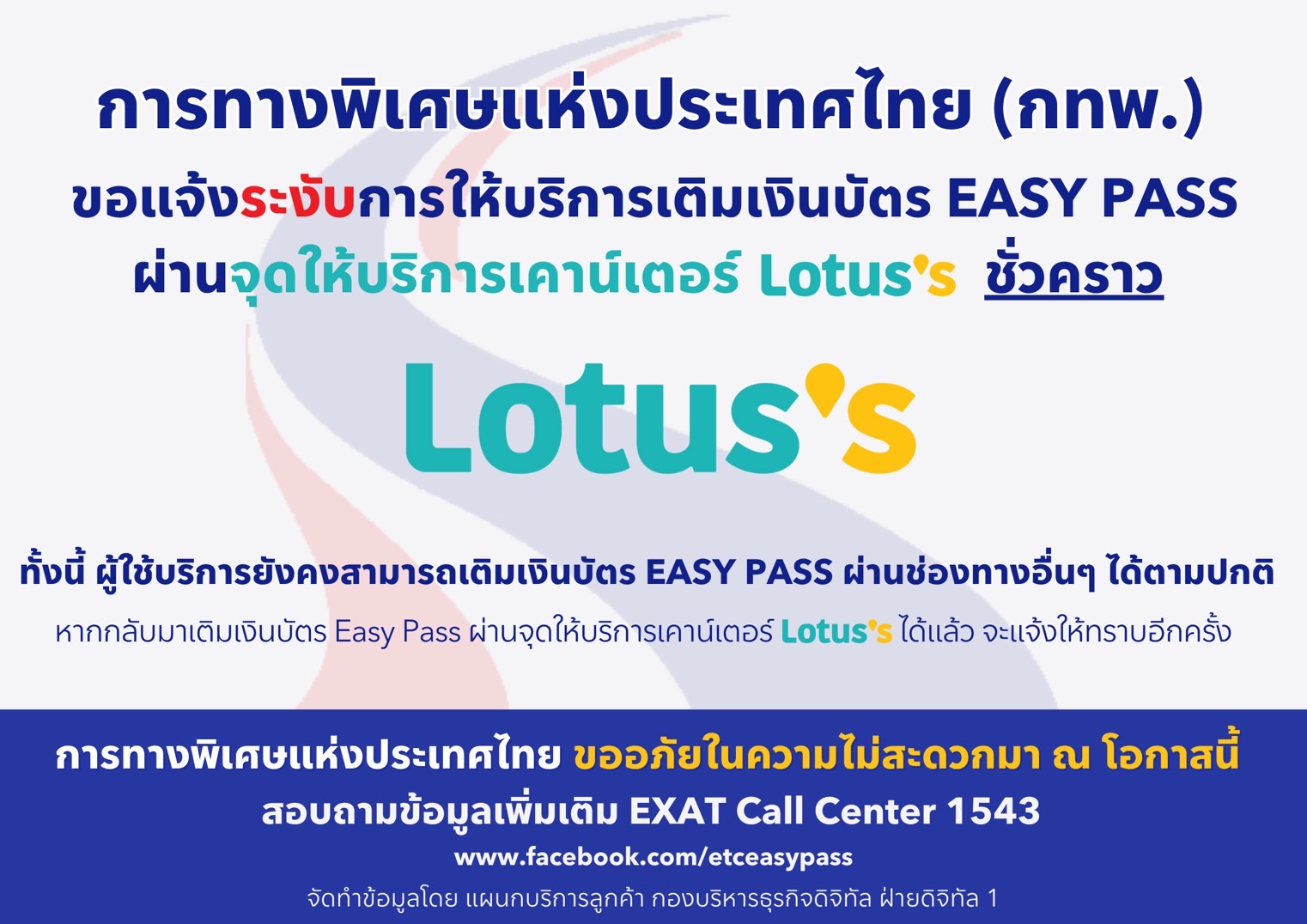 ระงับการให้บริการเติมเงินบัตร Easy Pass ผ่านจุดให้บริการ “Lotus's” เป็นการชั่วคราวตั้งแต่วันที่ 1 ตุลาคม 2567